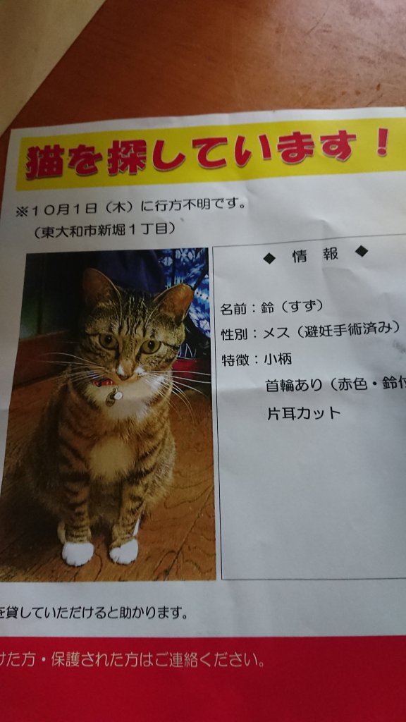 残念なお知らせです 東大和にゃんこの里、東大和80catの仲間たち 未分類 2020年11月22日 1 Minute 今月はじめに東村山で発見者が病院へつれていってくださいましたが亡くなりました、餓死です、家で飼ってる猫はなかなか生きていけないのです、たべるものが、ないのです、皆さん室内飼い猫は、脱走防止策をお願いします。悲しいことです。 共有: X で共有 (新しいウィンドウで開きます) X Facebook で共有 (新しいウィンドウで開きます) Facebook いいね 読み込み中… 関連 投稿者: 東大和にゃんこの里、東大和80catの仲間たち 東大和にゃんこの里、東大和80catの仲間たち の投稿をすべて表示 公開済み 2020年11月22日